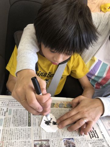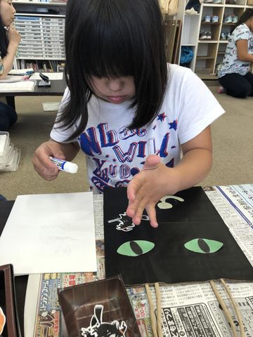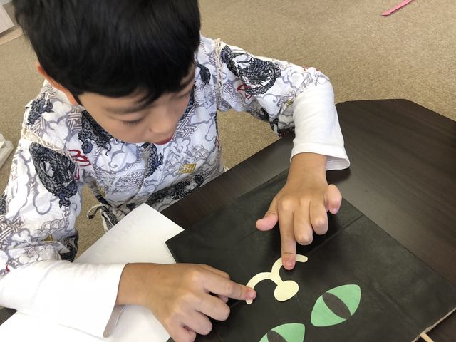 オバケやガイコツに顔を描いたり、のりで好きなところに貼って完成ませました