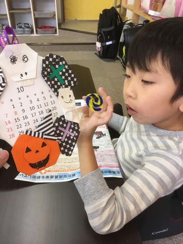 水曜日は英語の日なので先生にハロウィンバージョンでレッスンしてもらいましたよ