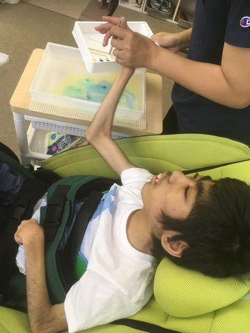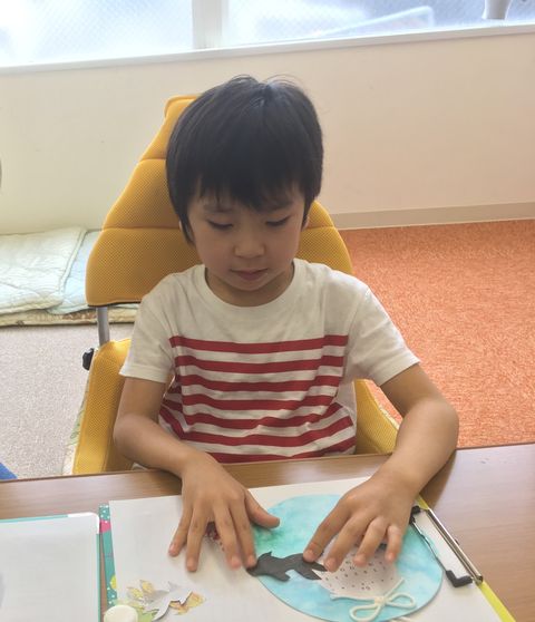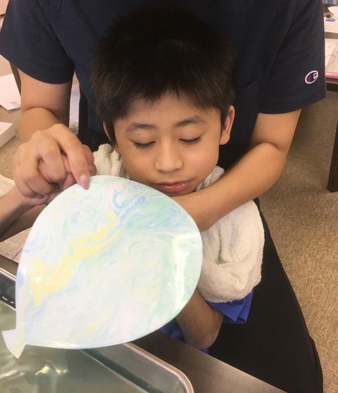 まずは、風船の形切った画用紙にマーブリングをしました