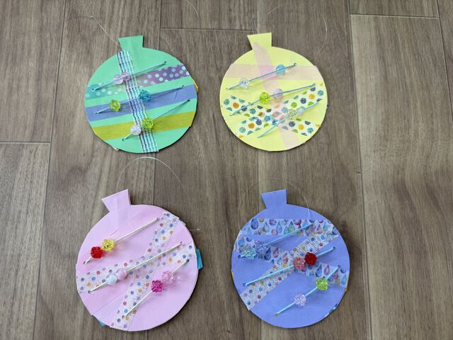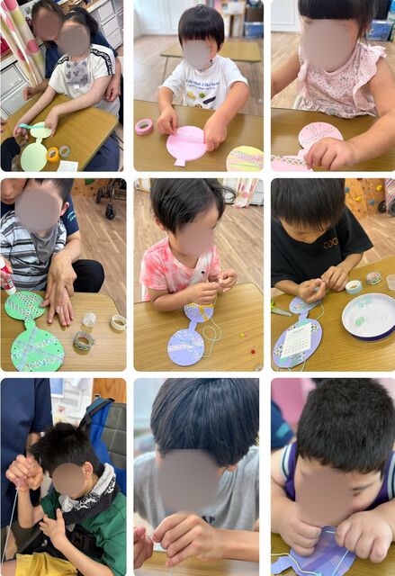 ヨーヨーに好きなデザインのマスキングテープを貼り、指先を使い集中してビーズの紐通しをしています。