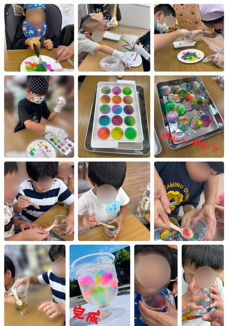 冷やし固まったカラフルなゼリーを見て子供たちの目はキラキラです